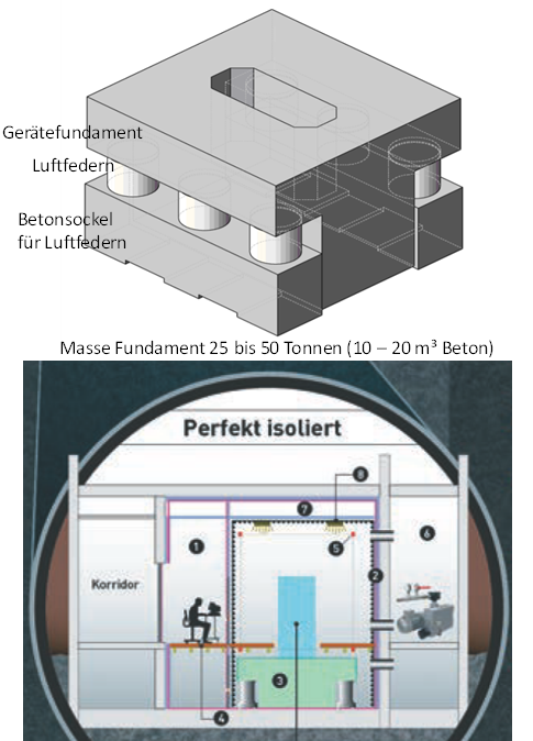 In diesem Projekt wurden für ein neues Forschungslabor der TU Wien in der Stadionallee in 1020 Wien, die zur Erzielung einer weitestgehenden „Vibrationsfreiheit“ notwendigen entkoppelten Gerätefundamente für Rasterelektronenmikroskope geplant und deren bauliche Umsetzung messtechnisch begleitet. Die Gerätefundamente bestehen aus einem „schweren“ starren Betonblock mit einem Eigengewicht von bis zu 60 Tonnen und einer Lagerung auf aktiven Luftfedern. Durch die aktive Luftfederlagerung werden Abstimmfrequenzen der Gerätefundamente von < 1,2 Hz erreicht und die Anforderungen für den störungsfreien Betrieb der Rasterelektronenmikroskope (VC-Curves) eingehalten. Grundlage für die Planung der Gerätefundamente und deren Luftfederlagerung waren Vibrationsmessungen der Immissionen am Baufeld. Die Vibrationsmessungen wurden in weiterer Folge baubegleitend durchgeführt und die Einhaltung der VC-Curves bestätigt.